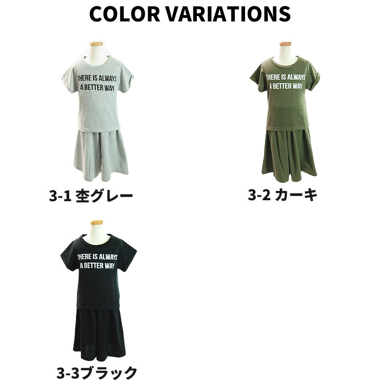 ITEM SPEC 商品名 「227-14」 キッズ ガールズ Tシャツ ガウチョパンツ セットアップ カラー 全3タイプ サイズ 110cm/120cm/130cm/140cm/150cm/160cm 素材・仕様 3-1ポリエステル75%綿25% 3-2、3-3、ポリエステル85%綿15% 生産国 中国製 おすすめ ポイント 人気定番アイテムの上下セット、プリントTシャツとガウチョパンツのセットアップの登場。